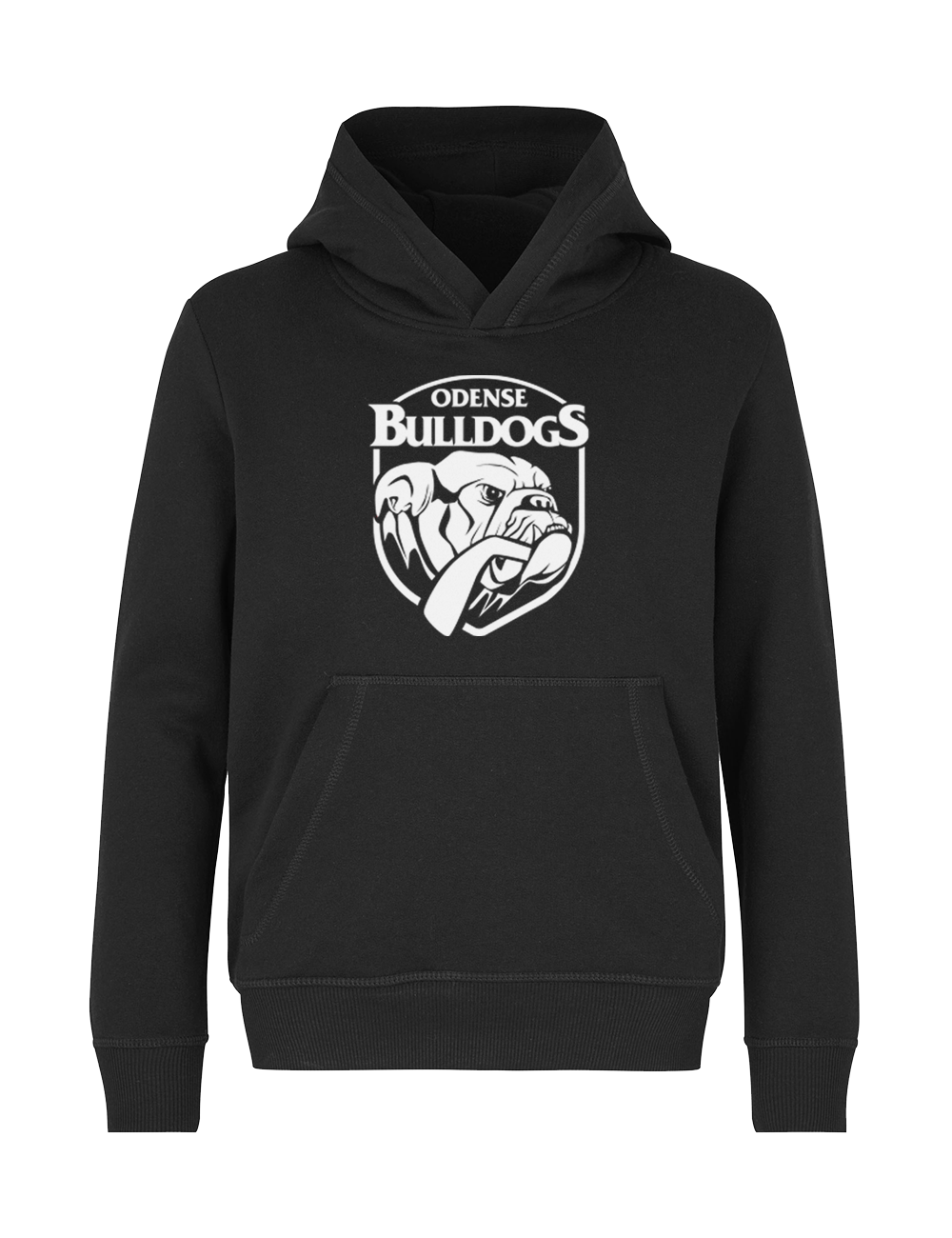 En klassisk hættesweatshirt med kængurulomme og det originale Odense Bulldogs logo i hvid på fronten, og #LetsGoBulldogs på ryggen. Hoodien er lavet med rib ved ærme og bund. Det er en hoodie i kraftig kvalitet, der har en børstet inderside, som gør trøjen ekstra blød og behagelig.