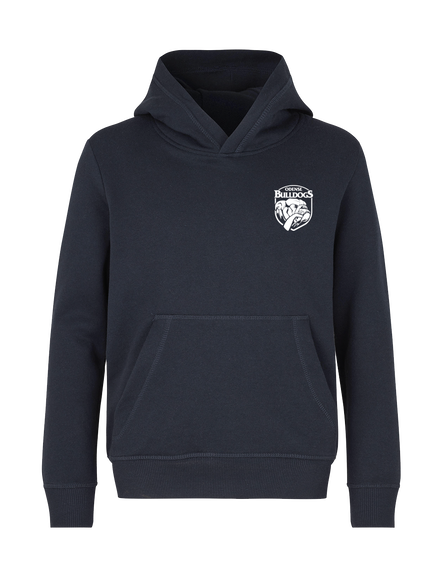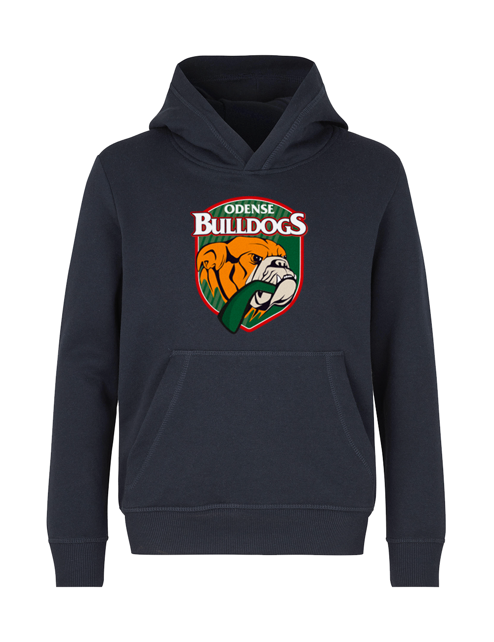 En klassisk hættesweatshirt med kængurulomme og det originale Odense Bulldogs logo i farver på fronten, og #LetsGoBulldogs på ryggen. Hoodien er lavet med rib ved ærme og bund. Det er en hoodie i kraftig kvalitet, der har en børstet inderside, som gør trøjen ekstra blød og behagelig.