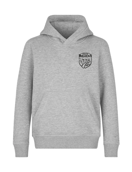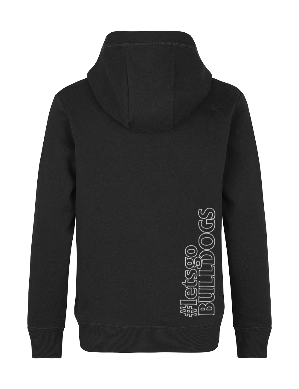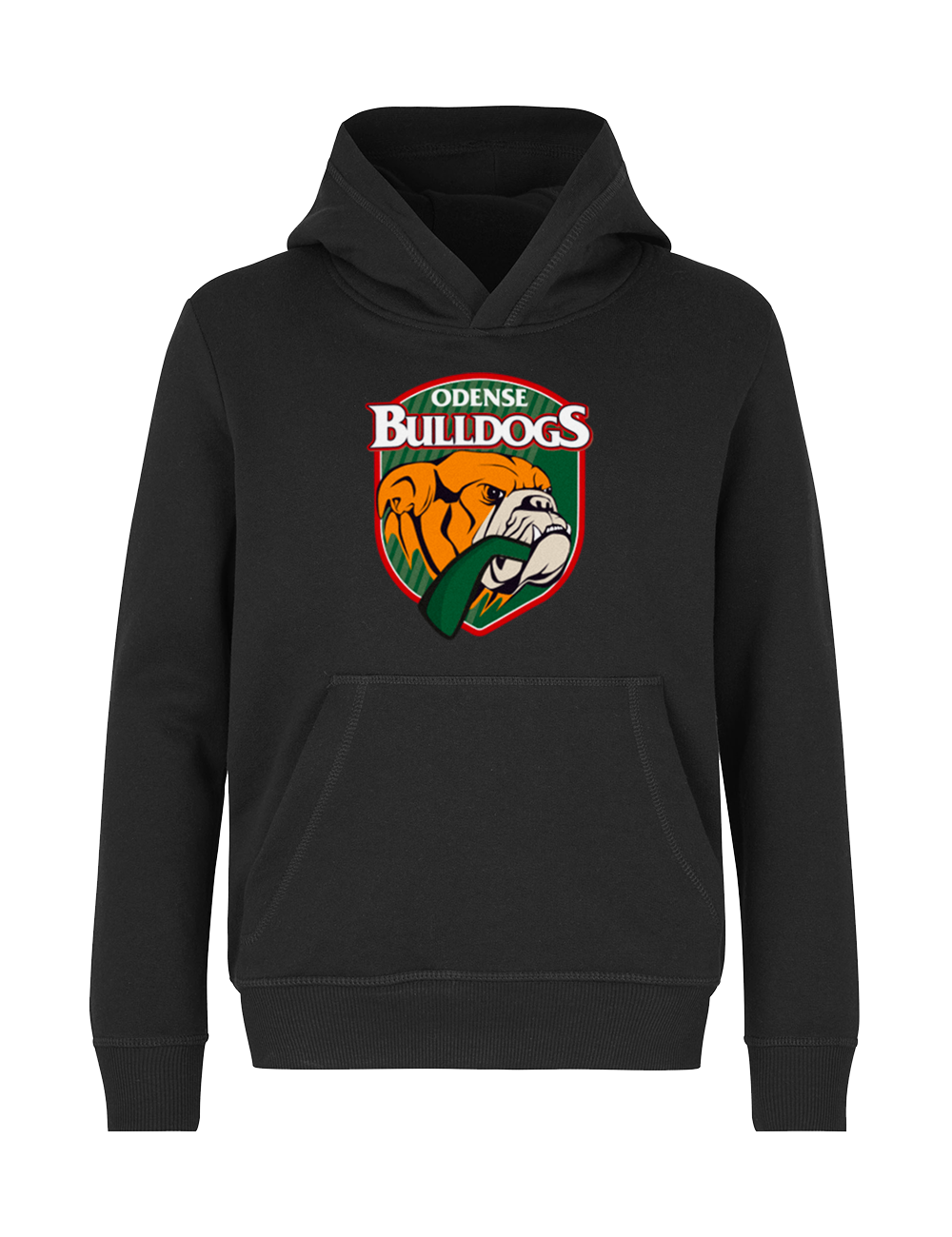 En klassisk hættesweatshirt med kængurulomme og det originale Odense Bulldogs logo i farver på fronten, og #LetsGoBulldogs på ryggen. Hoodien er lavet med rib ved ærme og bund. Det er en hoodie i kraftig kvalitet, der har en børstet inderside, som gør trøjen ekstra blød og behagelig.