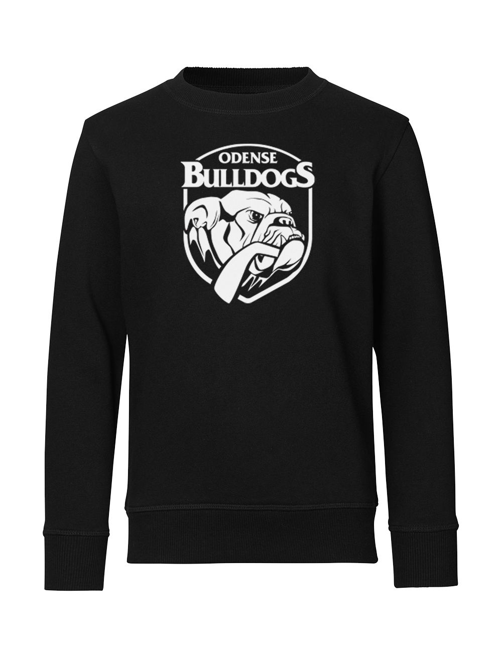 En klassisk sweatshirt i sort med Odense Bulldogs logoet i hvid på fronten, og #LetGoBulldogs på ryggen. Sweatshirten er lavet med rib ved hals, ærmer og bund. Det er en sweatshirt i kraftig kvalitet, der har en børstet inderside, som gør trøjen ekstra blød og behagelig.
