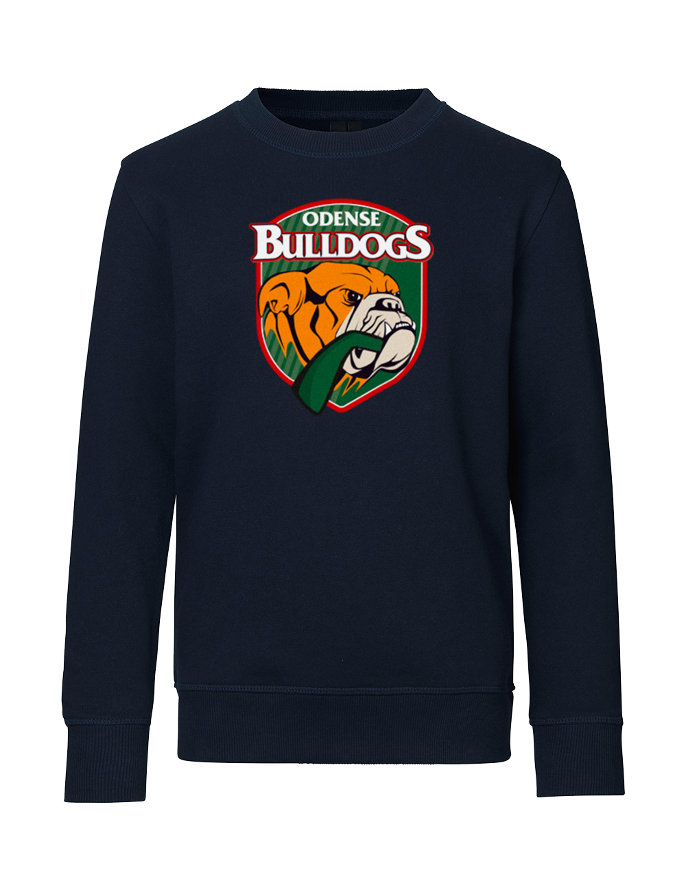 En klassisk sweatshirt i navy med Odense Bulldogs logoet i de klassiske klubfarver på fronten, og #LetGoBulldogs på ryggen. Sweatshirten er lavet med rib ved hals, ærmer og bund. Det er en sweatshirt i kraftig kvalitet, der har en børstet inderside, som gør trøjen ekstra blød og behagelig.