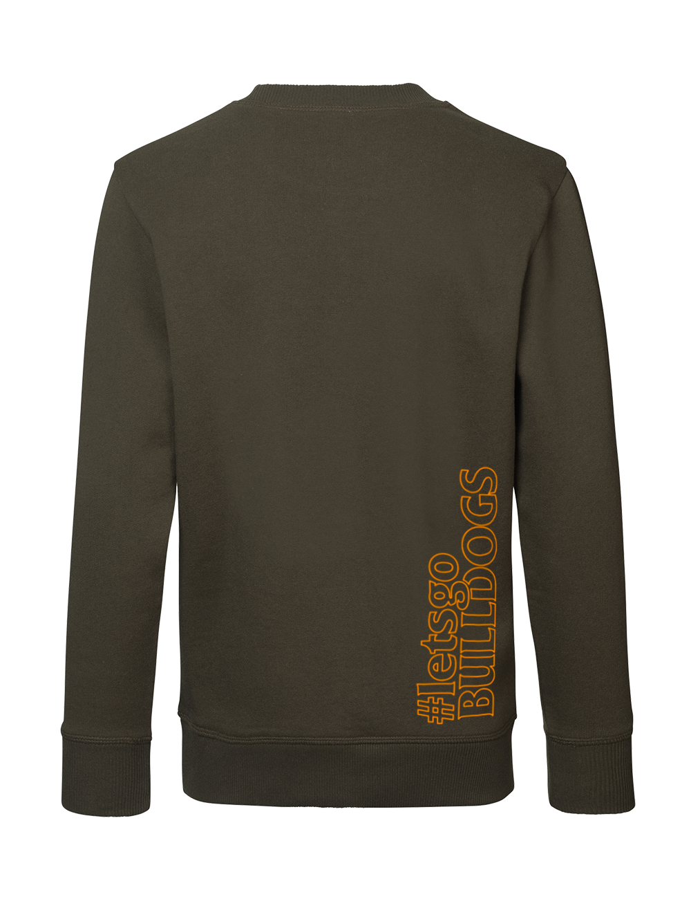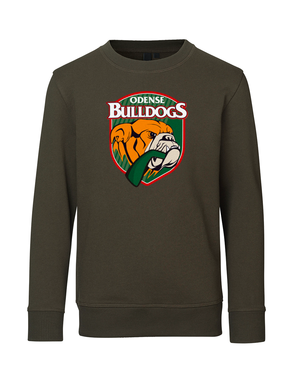 En klassisk sweatshirt i oliven med Odense Bulldogs logoet i de klassiske klubfarver på fronten, og #LetGoBulldogs på ryggen. Sweatshirten er lavet med rib ved hals, ærmer og bund. Der er tale om en sweatshirt i kraftig kvalitet, men med en børstet inderside, som gør trøjen ekstra blød og behagelig.