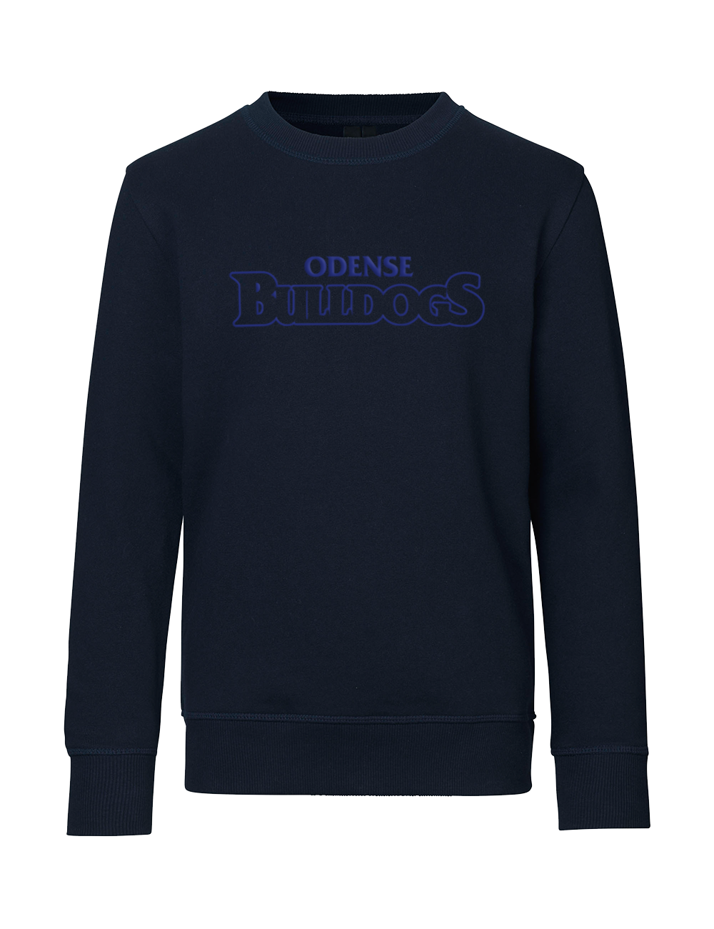 En klassisk sweatshirt i navy med Odense Bulldogs logoet i blå på brystet med puff effekt. Sweatshirten er lavet med rib ved hals, ærmer og bund. Det er en sweatshirt i kraftig kvalitet, der har en børstet inderside, som gør trøjen ekstra blød og behagelig.