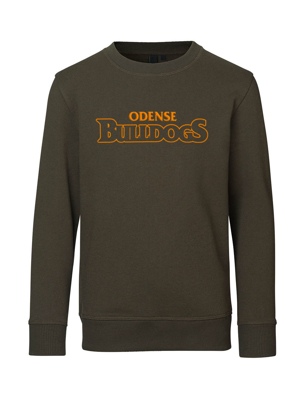En klassisk sweatshirt i oliven med Odense Bulldogs logoet i orange på brystet med puff effekt. Sweatshirten er lavet med rib ved hals, ærmer og bund. Det er en sweatshirt i kraftig kvalitet, der har en børstet inderside, som gør trøjen ekstra blød og behagelig.