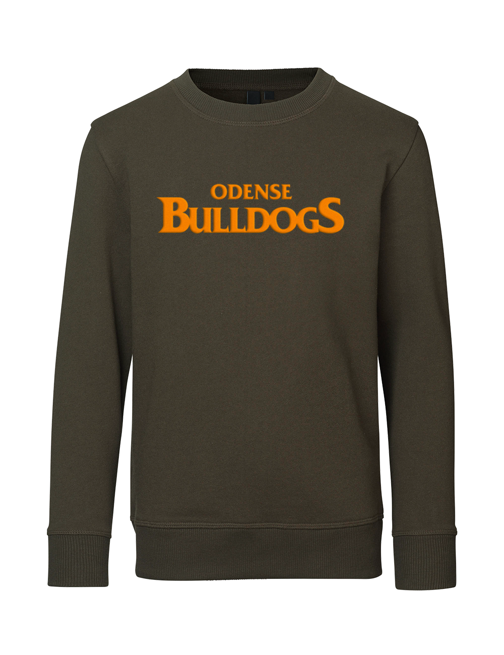 En klassisk sweatshirt i oliven med Odense Bulldogs logoet i orange på brystet med puff effekt. Sweatshirten er lavet med rib ved hals, ærmer og bund. Det er en sweatshirt i kraftig kvalitet, der har en børstet inderside, som gør trøjen ekstra blød og behagelig.