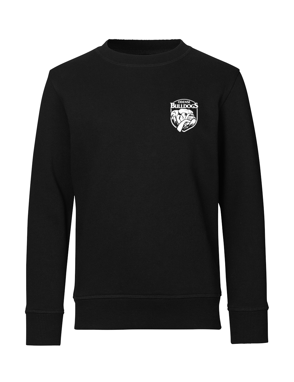 En klassisk sweatshirt i sort med Odense Bulldogs logoet i hvid på brystet. Sweatshirten er lavet med rib ved hals, ærmer og bund. Det er en sweatshirt i kraftig kvalitet, der har en børstet inderside, som gør trøjen ekstra blød og behagelig.
