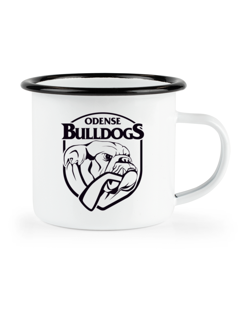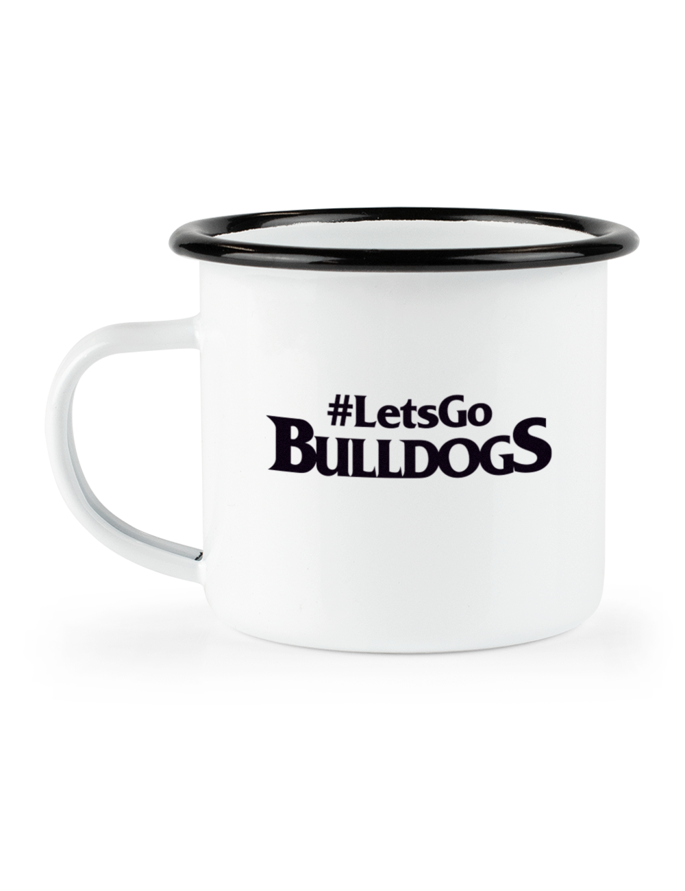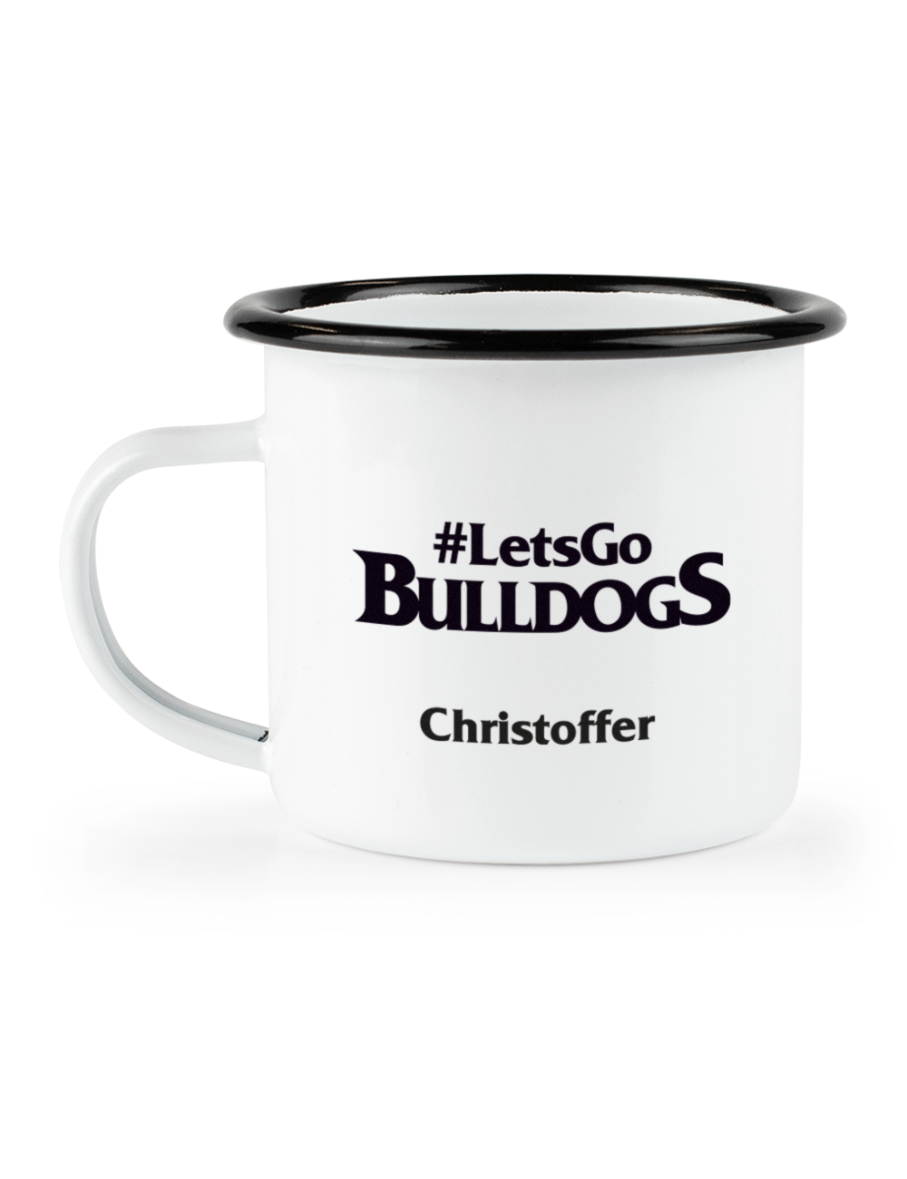 Dette hvide emaljekrus er lavet #LetsGoBULLDOGS og logoet på den anden side. Du har mulighed for at personliggøre kruset ved at tilføje dit navn på den ene side. Kruset er lavet med en sort kant, samt hank hvilket gør det brugbart til både varme og kolde drikke.
