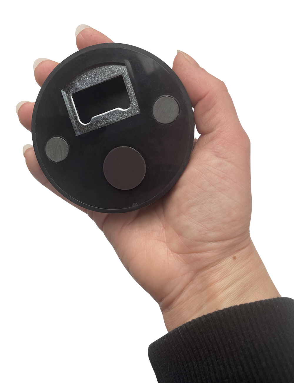 Denne oplukker er formet som en puck, og ligger godt i hånden og er nem at bruge. Den er lavet med en magnet, så den også kan bruges som magnet på køleskabet, opslagstavlen eller et tredje sted. På fronten ses det klassiske Odense Bulldogs logo.
