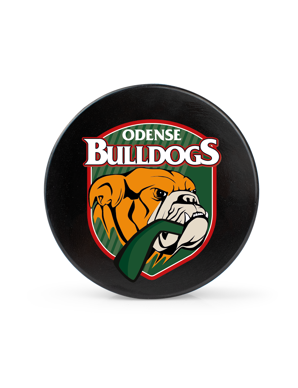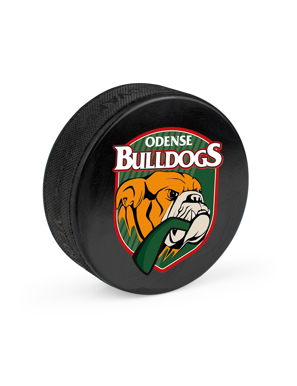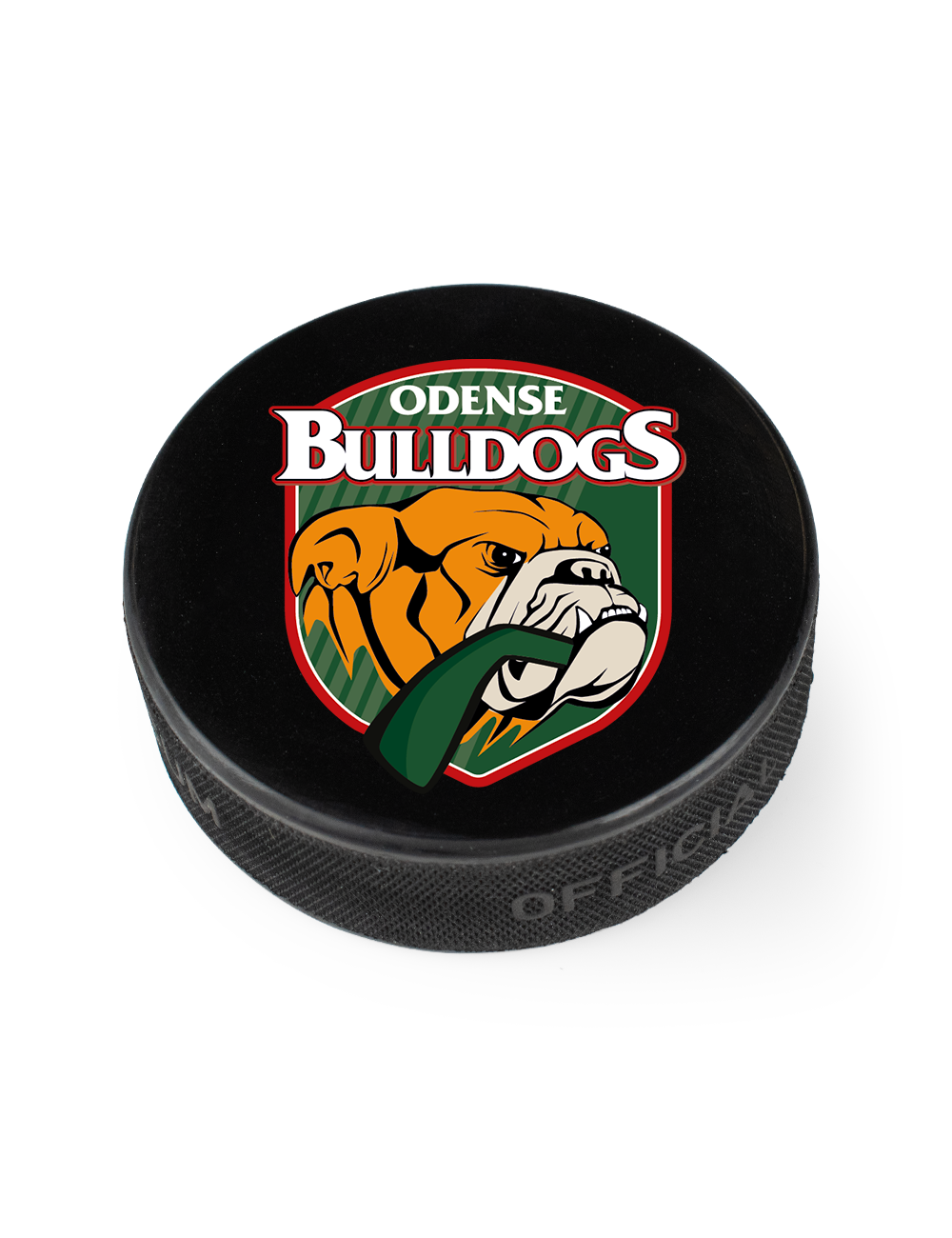 En original puck med Odense Bulldogs logo på den ene side. Brug den til spil, eller til pynt på hylden.