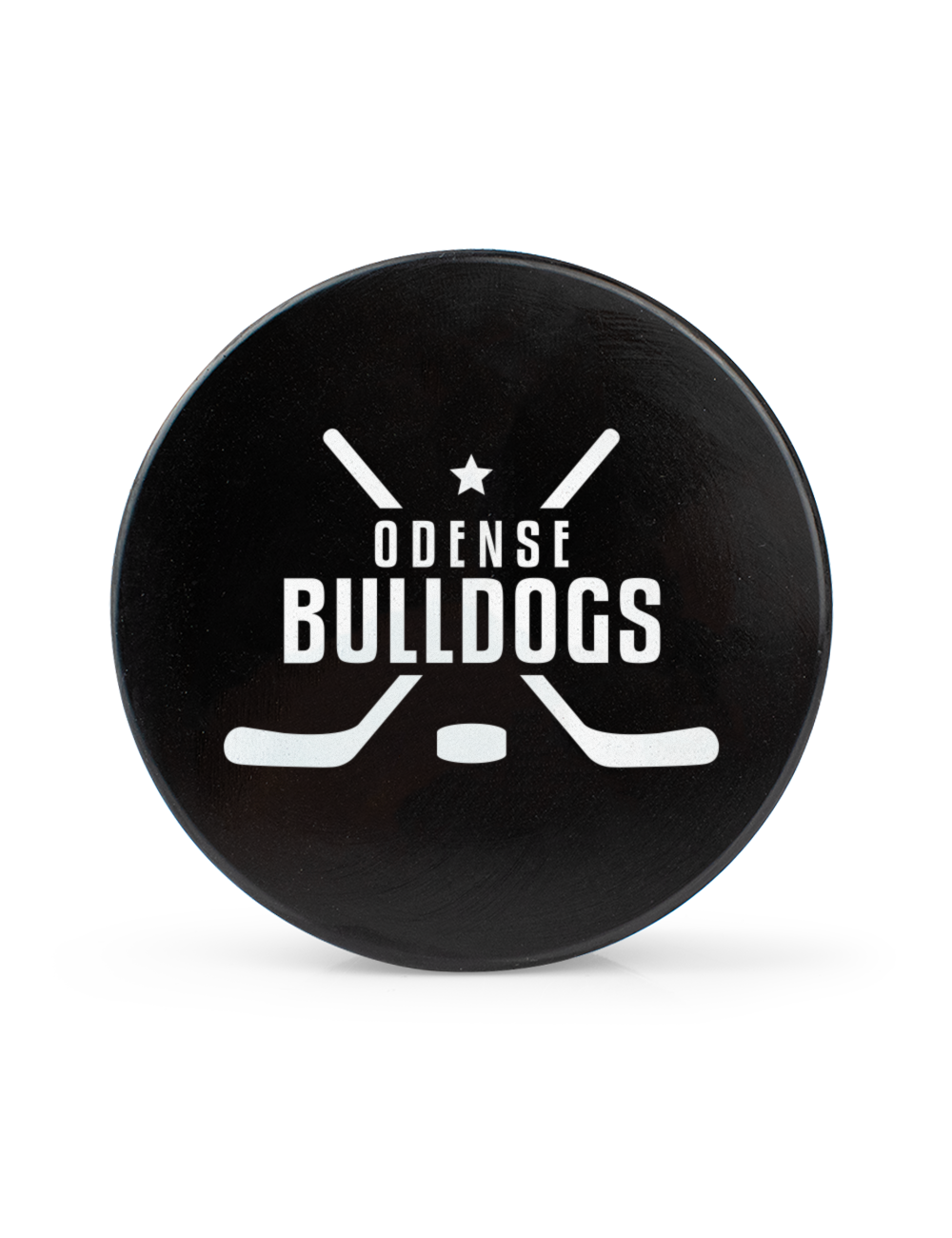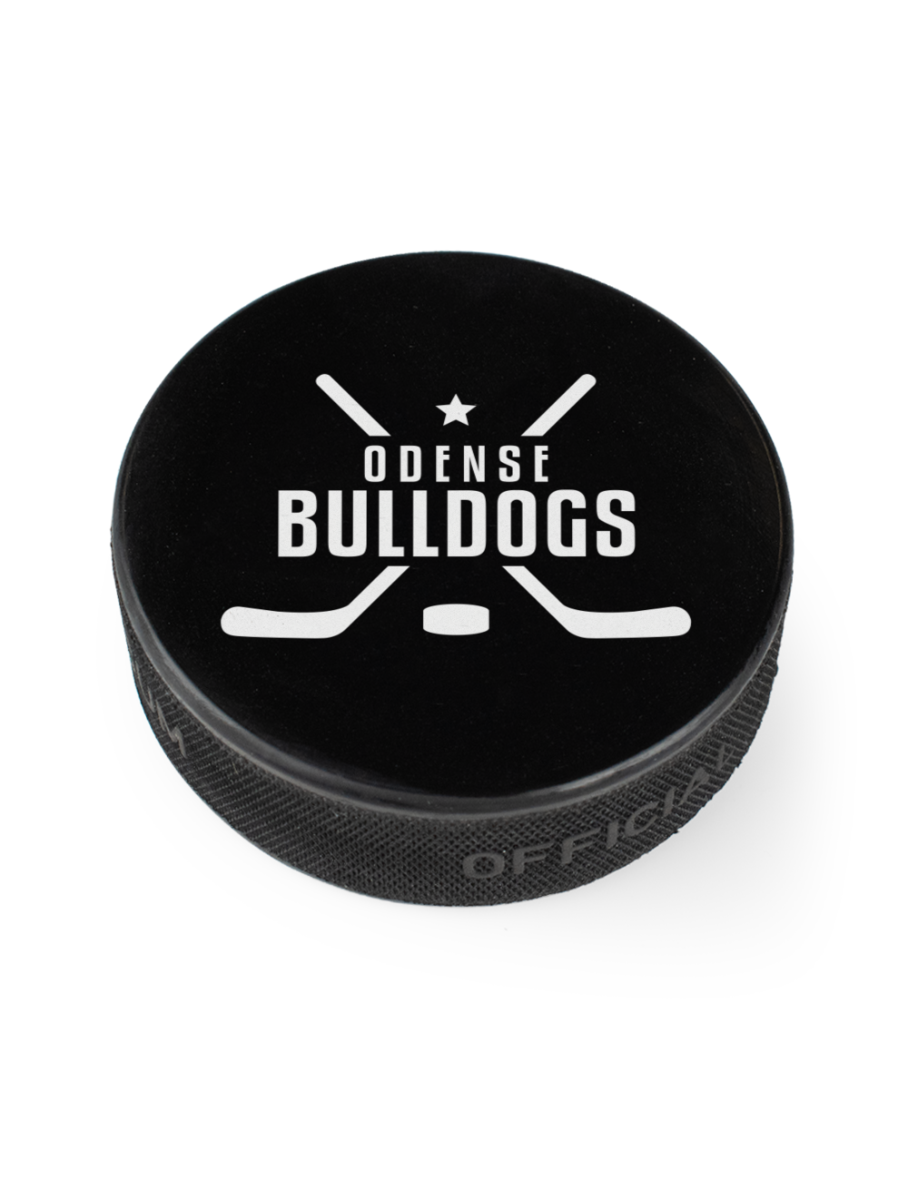 En original puck med Odense Bulldogs logo og klassisk hockeystave-design på den ene side.